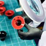 Während der Entwicklung nutzen die Dyson Ingenieure einen Roboter-Lackierarm, um einen Klebstoff namens „Size“ auf den roten Untergrund aufzutragen. Der Roboterarm sorgt dafür, dass der Klebstoff gleichmäßig verteilt wird.