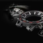 Genauso wie das verwendete Material, findet auch das auffällige Zifferblatt-Design seine Inspirationsquelle im Motorsport. Große, weiße Stabindizes sowie Zeiger mit fluoreszierender Beschichtung setzen dynamische Akzente, in Verbindung mit optimaler Ablesbarkeit und unterstreichen den sportiven Look. Angelehnt an die Fahrwerksstreben, die einem Rennwagen die nötige Widerstandsfähigkeit geben und ihn zuverlässig auf der Strecke halten, ziert ein Kreuz das Zifferblatt und verweist auf die jeweiligen Funktionen der vier Drücker hin.