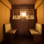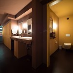 Im Untergeschoss des Restaurants liegen die großzügigen Waschräume, die mit Sanitärkeramik von Villeroy & Boch ausgestattet sind und den Gast in besonderer Weise überraschen. Der gesamte Sanitärbereich lädt zu einer Reise durch Indien ein. Er ist indischen Zugabteilen nachempfunden, etwa mit Spiegeln in Form abgerundeter Fenster oder mit Haltegriffen. Gleichzeitig schlägt er einen stilistischen Bogen zwischen dem mondänen Orient-Express und einem überfüllten Pendler-Zug. Vor den Toiletten teilen sich Männer und Frauen einen gemeinsamen „Wartebereich“, der mit wilder Plakatierung und Kaugummiautomat gestaltet ist. Hinter den Türen öffnen sich diametrale Er-lebniswelten: Während Durchsagelautsprecher, Ventilatoren und Holzklasse das Interieur des Männerbereiches bestimmen, geht es bei den Damen mit edlen Furnieren, goldenen Armaturen und gerahmten Spiegeln luxuriös zu.