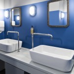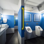 Auch wurden unterschiedliche Sanitärelemente von Villeroy & Boch ausgewählt: Eckige Waschtische für die Herren, ovale für die Damen. Obwohl beide Waschtischformen aus der gleichen Serie Architectura stammen, entfalten diese im jeweiligen Raumam-biente eine völlig andere Anmutung: praktisch-funktional bei den Herren, designstark-organisch bei den Damen. Diese Varianten zeigen, welche vielfältigen Planungs- und Gestaltungsoptionen das Systemkonzept Architectura für Planer und Architekten eröff-net. Für WC-Komfort sorgen innovative DirectFlush-WCs aus der Bestsellerkollektion Subway 2.0. Ihr Vorteil: Anstelle eines herkömmlichen Wasserrands sind DirectFlush-WCs spülrandlos ausgeführt und damit besonders einfach hygienisch sauber zu halten. Die WCs sind mit den extraflachen Sitzen SlimSeat ausgestattet und via ViConnect, der Vorwandinstallationslösung von Villeroy & Boch, montiert. Eckige Drückerplatten ma-chen das Designstatement der modernen WCs komplett. In der Herrentoilette wurden zusätzlich zwei Subway-Absaug-Urinale mit der patentierten Kartusche ViChange ein-gebaut, die sich besonders schnell und unkompliziert wechseln lässt. Auch in der Mitar-beitertoilette wurden Sanitärelemente von Villeroy & Boch eingesetzt: Architectura verbindet ein klares, modernes Design mit bester Funktionalität.