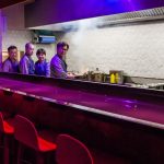 Entsprechend futuristisch mutet das Restaurant an: mit einer Mischung aus Zwielicht, Düsternis und neonfarbenen Leuchtfäden, die sich durch den Raum ziehen, entsteht eine Spannung, die gleichzeitig entspannend wirkt, obwohl die gewohnte Ordnung ausgesetzt wird.