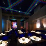 Der sich anschließende Hauptraum ist an zwei Seiten von großen Fensterscheiben umgeben und präsentiert eine Szenerie wie aus einem Science Fiction Film. Zwischen rohen Betonwänden finden sich 40 Plätze an kleinen, durch Licht-Spots in Szene gesetzten Tischen, neben denen das Blau der Stühle hervor leuchtet. Ein Spiel aus Licht und Schatten lässt eine Zwielichtigkeit entstehen, die eine unergründbare Begehrlichkeit weckt. Selbstleuchtende Schnüre bilden Leuchtstraßen an der Decke, die sich durch den Raum ziehen. Es herrscht eine gewisse Spannung und Energie, progressiv und elektrisierend zugleich. Die Dunkelheit des Raums wird durch eine Lichtinstallation aus Galaxy-Leuchtkästen mit tausenden von Sternen durchbrochen, die ins Innere strahlen.