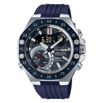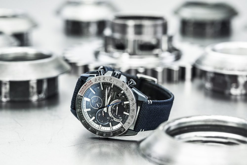 Etwas zurückhaltender und mit einer klaren Linienführung im Design ist die CASIO Edifice EFS-S590AT der perfekte Begleiter für Business und Freizeit. Ihren edlen Ausdruck erhält die Uhr durch ihre polierten und mattierten Elemente des Edelstahlgehäuses- und Armbands. Besonders markant ist dabei der rotierende Innenring, der ebenso wie das Zifferblatt aus widerstandsfähigem Karbon gefertigt ist. Drei Hilfszifferblätter im typischen AlphaTauri-Blau runden das Design des Zifferblatts ab. Bei 6 Uhr kann der Ladezustand des Akkus wie im Cockpit eines Rennwagens sowie der Minutenzähler abgelesen werden. Zudem besitzt die Uhr einen 24 Stundenzähler bei 9 Uhr und ist bei 12 Uhr mit der kleinen Sekunde versehen. Der Chronograph bietet eine Countdown-Anzeige auf dem Innenring und lässt sich bequem über den Drücker bei 8 Uhr einstellen, wobei der Stundenzeiger, die Sekunden bis zum Start anzeigt. Sobald der Zeiger bei 8 Uhr angekommen ist, leuchten die Stabindizes blau auf und signalisieren damit den Beginn des Countdowns. Der Chronograph ist außerdem mit der von CASIO entwickelten und nachhaltigen Tough Solar® Technologie ausgestattet. Kleinste Solarzellen sind auf dem Zifferblatt integriert und sorgen so für eine leistungsstarke Energieversorgung. Ein Akku speichert die nicht verwendete Energie und gewährleistet so eine Dunkelgangreserve von bis zu 24 Monaten. Ein umweltfreundliches Konzept, das CASIO bereits seit Beginn der 80er Jahre nutzt.